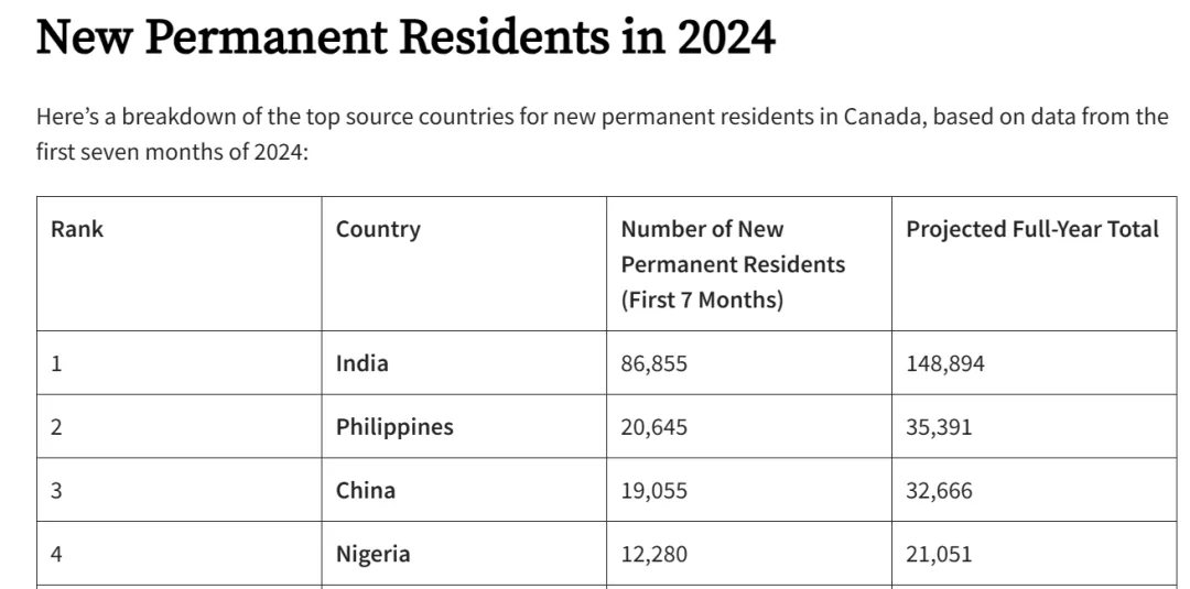 从加拿大统计局的官方列表可看出,在2024年,印度移民已呈压倒性优势位居第一,印裔人数是中国加拿大移民的近5倍。