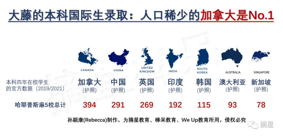 我把家长们所关心的国际生大藤录取比例做了个对比表。这里的大藤是指哈佛、耶鲁、普林斯顿、斯坦福、麻省理工。数据全部来源于每所学校的官网(按护照划分的4年大学本科学生的人数)。